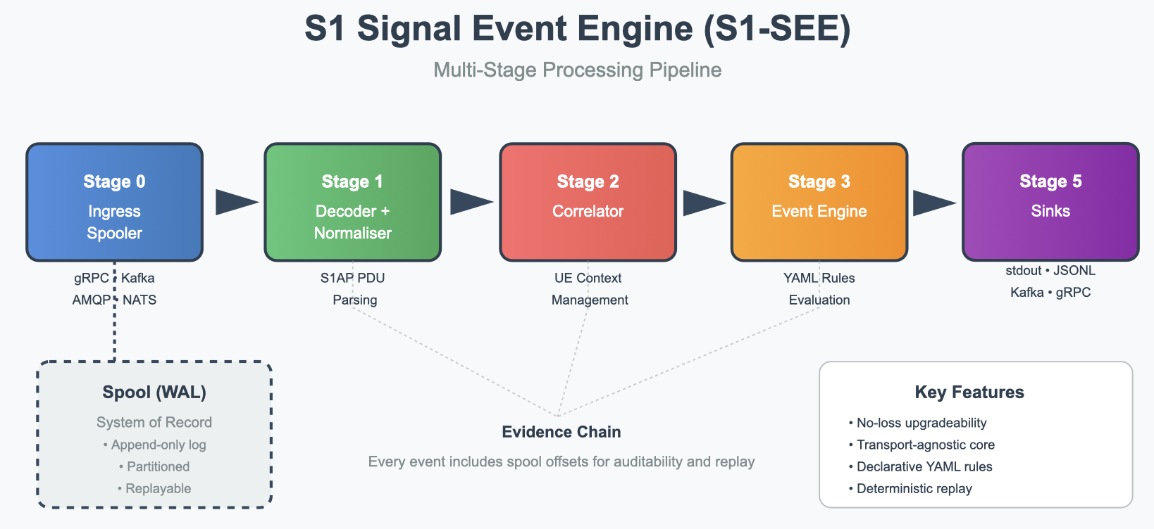 S1-SEE (S1 Signal Event Engine) is a production-oriented software system designed for Mobile Network Operators (MNOs) and telecom researchers to ingest, process, and analyse LTE S1AP Protocol Data Units (PDUs), generating structured events for analytical processing by separate applications. The system transforms raw signalling data from the LTE S1 interface into actionable events through a modular, replayable real-time pipeline that maintains data integrity and provides full traceability.
